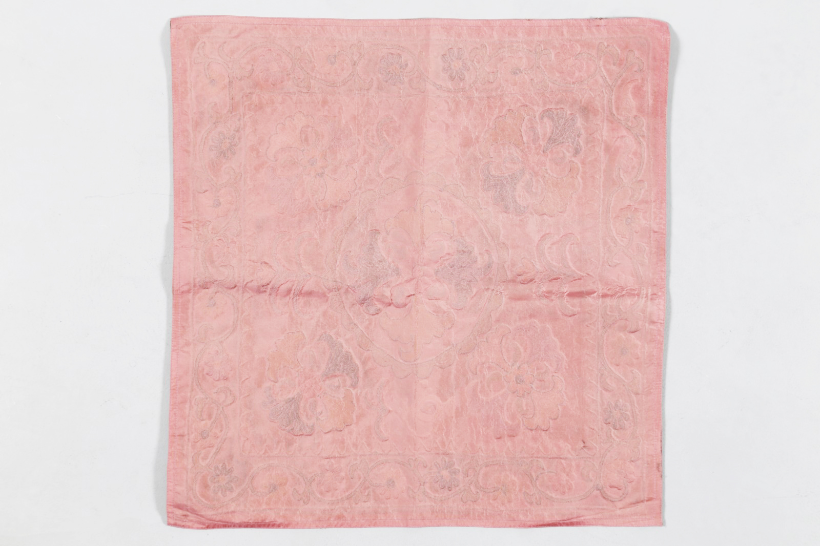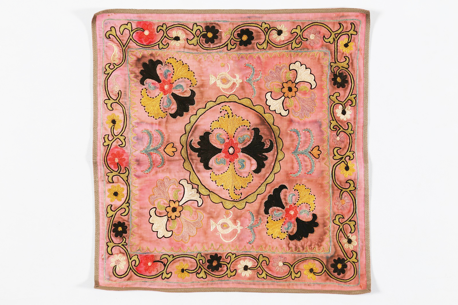 Arte Islamica Stendardo o copri teiera in seta Lakai rosato Afghanistan Settentrionale, inizio XX secolo. -. Cm 59,00 x 59,00. Piccolo tessuto quadrato ricamato a punto catenella con motivi floreali, vegetali e due piccole teiere ai lati del ricamo centrale. Il tessuto è da ricondurre all'artigianato turcomanno o Kajak. Qualche macchia ed usure.