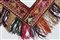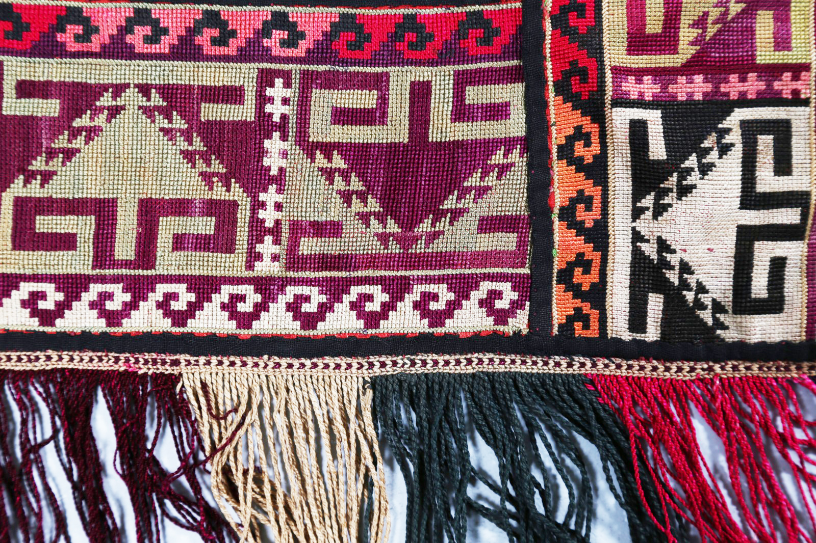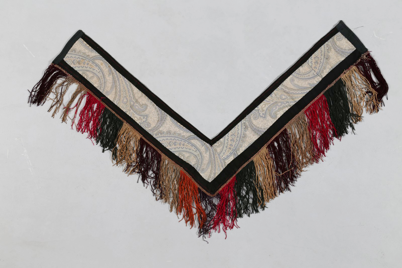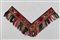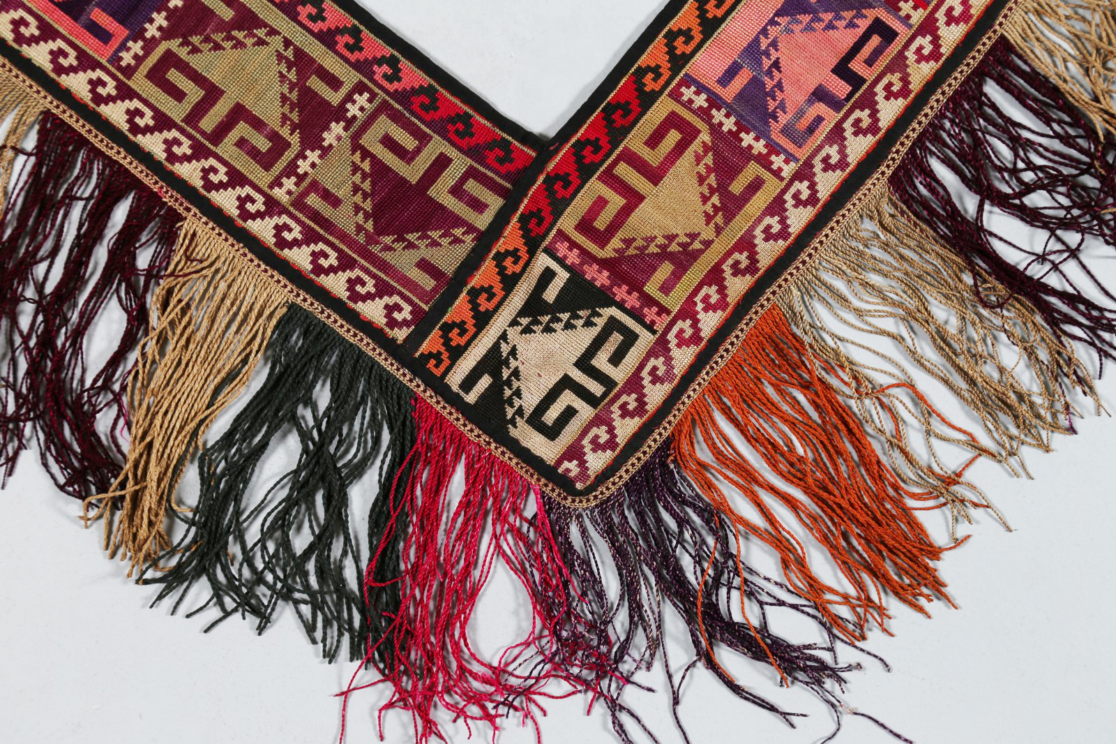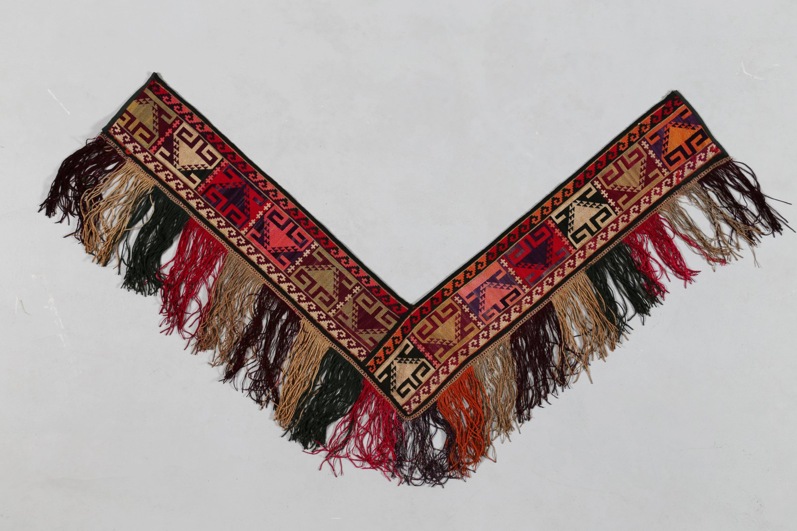 Arte Islamica Ornamento da abitazione turcomanno in seta Asia Centrale, inizio XX secolo. -. Cm 60,00. Sottile striscia di tessuto a forma di V con frangia decorata con elementi stilizzati in sequenza nei toni del verde, prugna, senape e rosso. Tessuto di supporto sul retro.