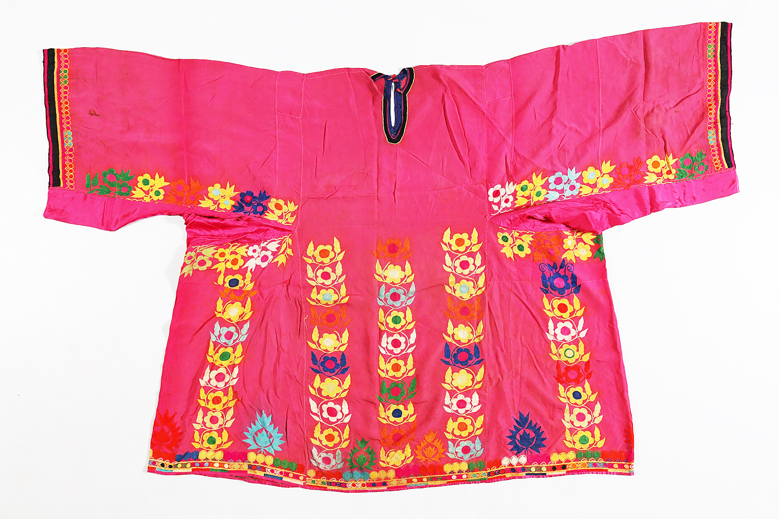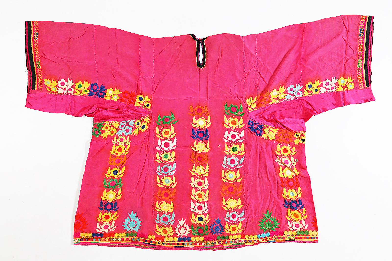 Arte Islamica Vestito femminile in seta rosa Balochistan, inizio XX secolo. -. Cm 121,00. Ampio vestito in seta rosata ricamato con filo di seta a motivo floreale ripetuto in file verticali nella parte inferiore e sulle ampie maniche.