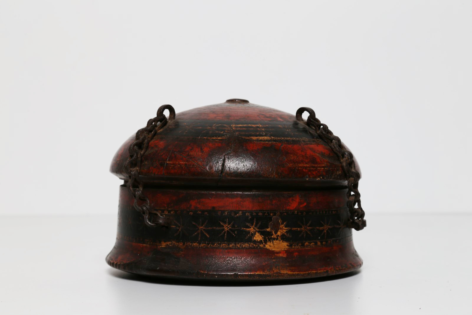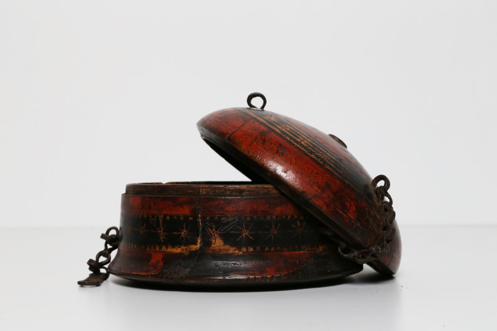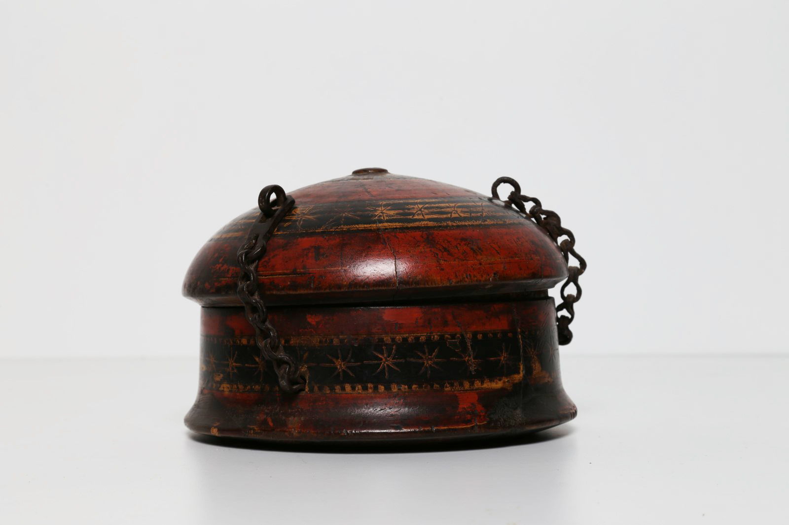 Arte Indiana Scatola porta turbante in legno laccato India, Rajasthan, inizio...