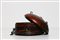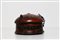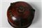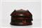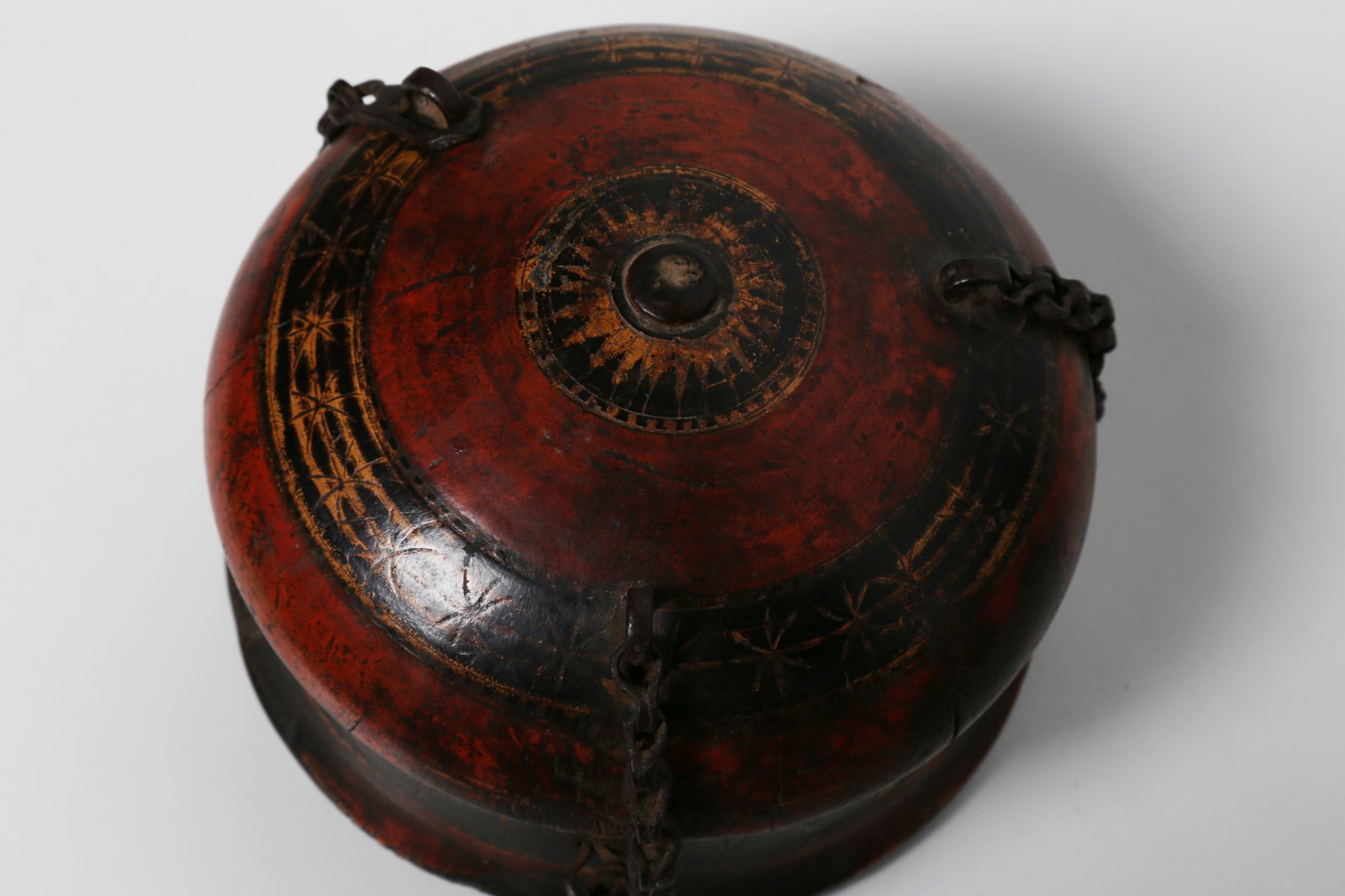 Arte Indiana Scatola porta turbante in legno laccato India, Rajasthan, inizio XIX secolo. -. Cm 19,00 x 10,00. Scatola in legno a sezione circolare con meccanismo di chiusura costituito da tre catene che uniscono contenitore e coperchio. Sullo sfondo color porpora, la decorazione consta di tre fasce scure, una sul corpo principale e due concentriche sul coperchio, incise e dipinte con motivo di stella stilizzata. L'oggetto è corredato di tutti gli elementi originali.