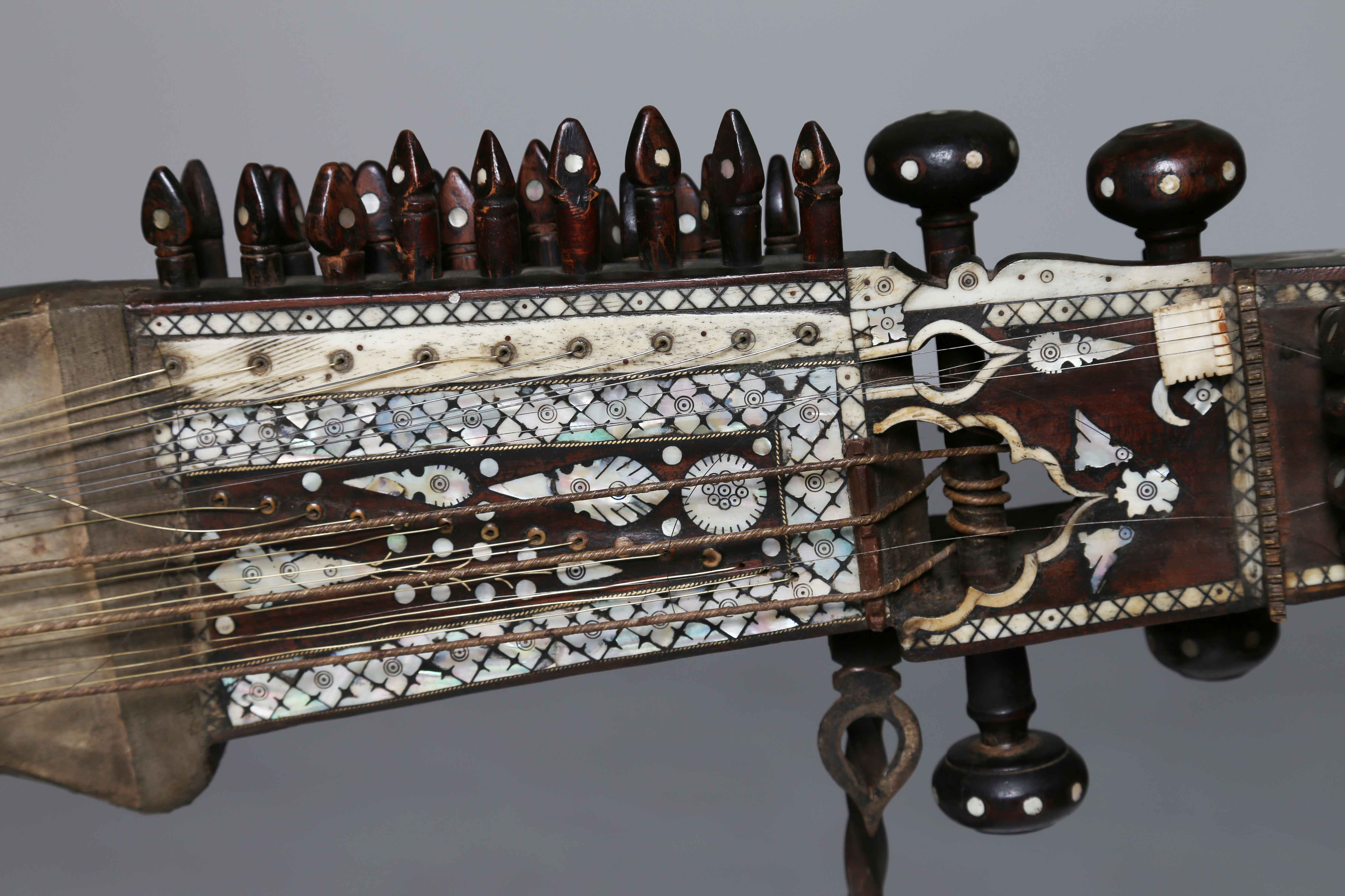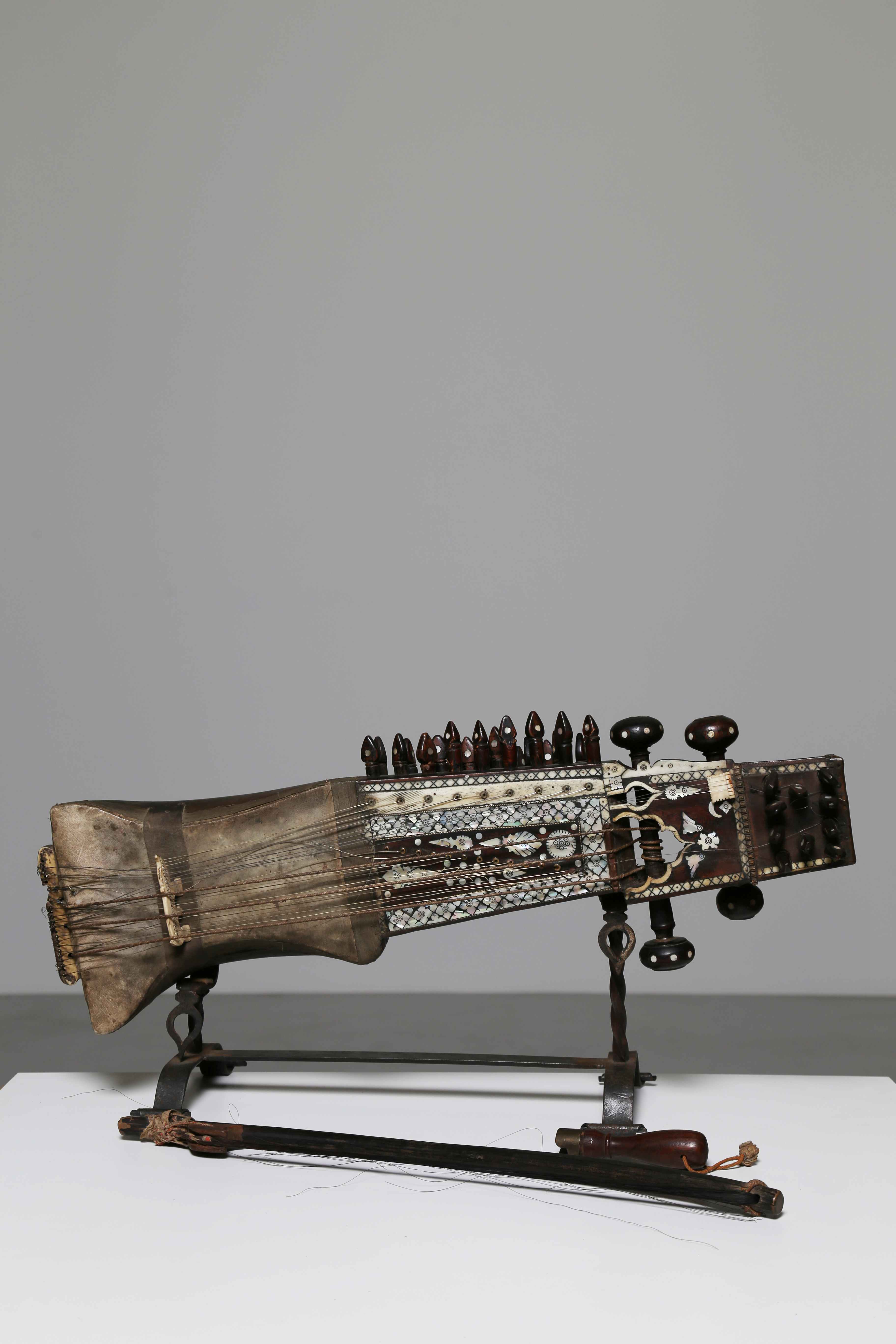 Arte Indiana Saranghi, strumento musicale a corde India/Afghanistan, XIX secolo. -. Cm 69,50 x 10,50 x 16,00. Saranghi realizzato in legno rossastro con ricchi intarsi in avorio e madreperla, presenta la cassa armonica rivestita in pelle ed è accompagnato da archetto, accordatore e base di supporto non coeva.
