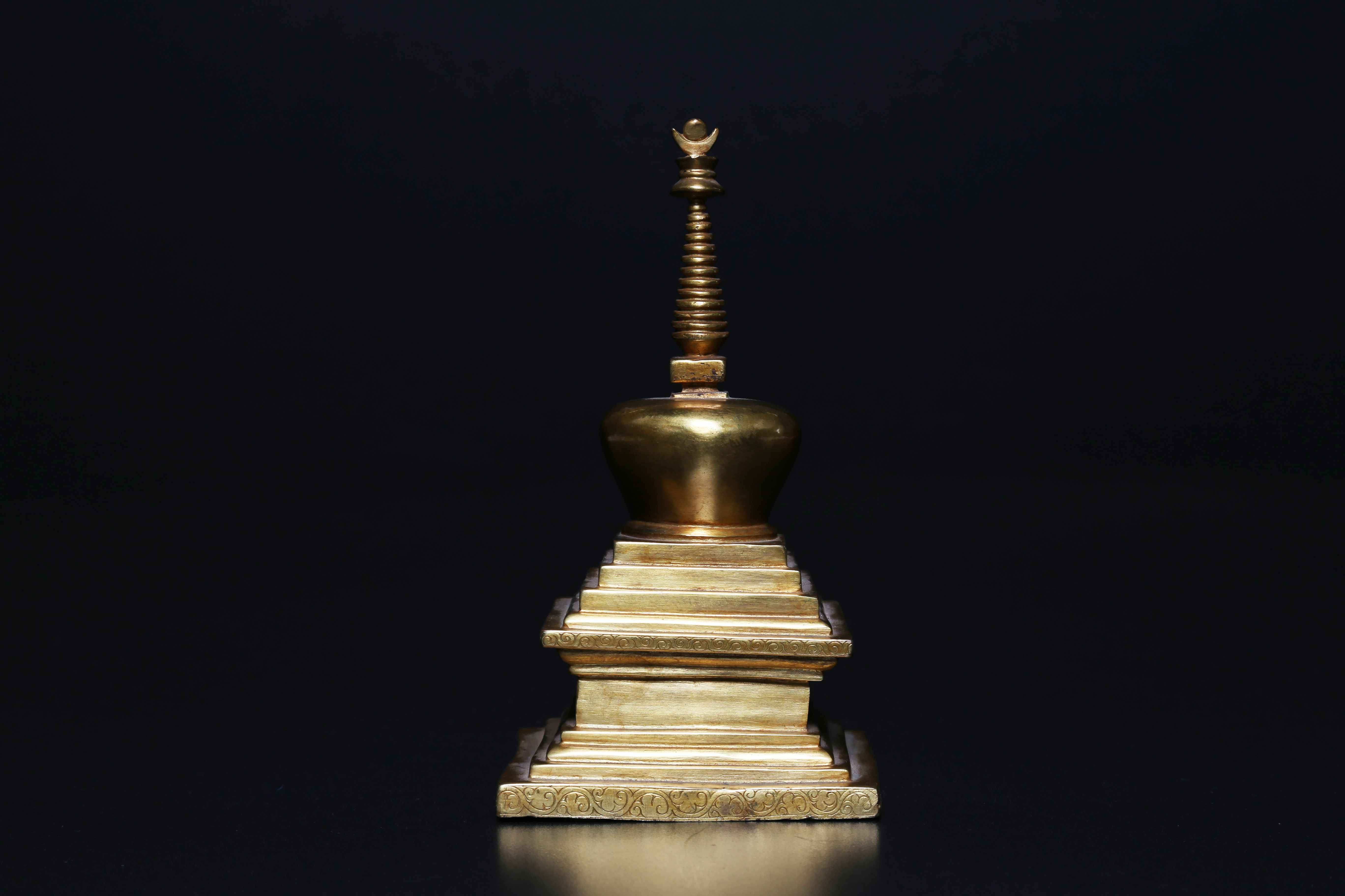 Arte Himalayana Stupa in bronzo dorato Tibet, inizio XX secolo. -. Cm 10,00 x 19,00. Oggetto rituale buddhista lo stupa dovrebbe contenere reliquie, ma la sua funzione è per lo più simbolica poichè rappresenta il corpo di Buddha e gli elementi che la compongono sono metafora degli elementi cosmici. Base sigillata.