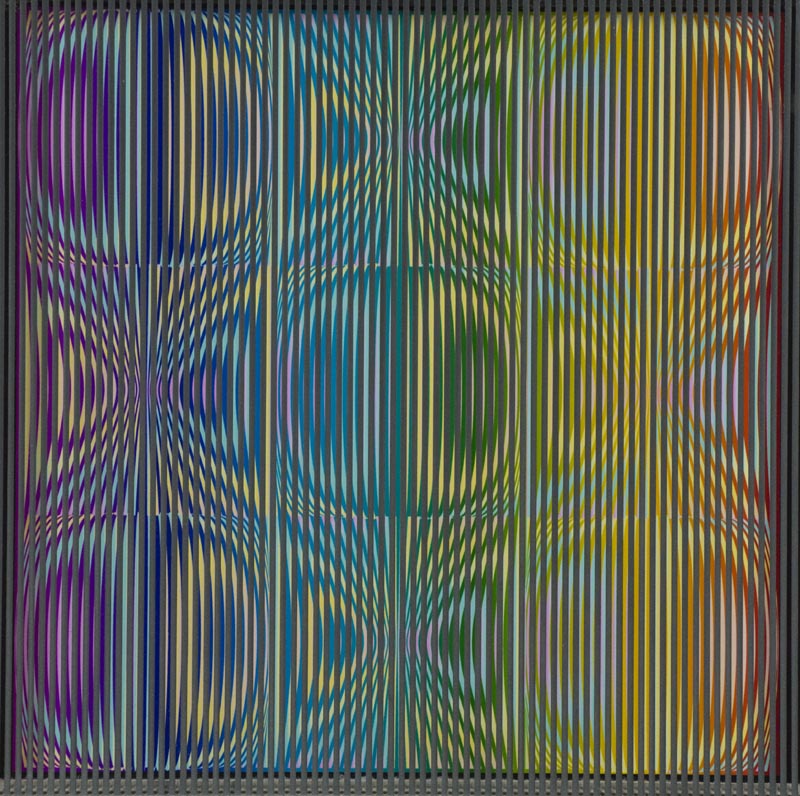 Alberto Biasi (Padova 1937) Vibrazioni iridescenti 1999 Struttura modulare cromo-cinetica su tavola, cm. 50x50 Sul verso: firma, titolo, data, dedica a persona e timbro "Alberto Biasi", con Reg. n° CO 264, Scritto dell'Artista: " Appartiene al ciclo degli Ottico-cinetici degli anni '60". Autentica dell'Artista su foto, con timbro a secco e Reg. n° CO 264.