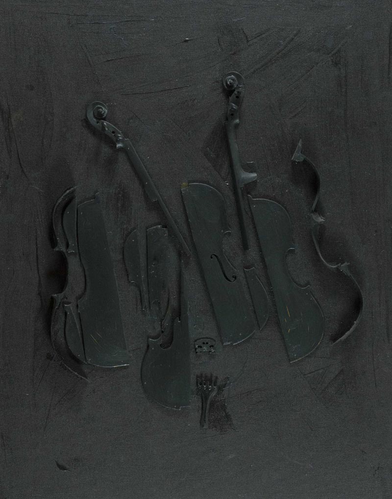 Arman (Nizza 1928 New York 2005) Senza titolo 2004 Accumulazione di strumento musicale e colori acrilici, su tela riportata su tavola, cm. 102x81x10 Firmato sul lato inferiore; Sul verso: etichetta "Arman Studio", New York, con descrizione. Autentica dell'Archivio Dante Vecchiato su foto con Archivio n° G0107-1255 con Autentica dell'Artista. Certificato di Garanzia e Autenticità "Meeting art", Vercelli.