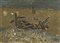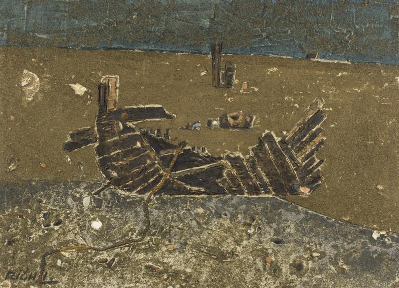 Federico Righi (Trieste 1908 1987) Barca sulla spiaggia 1961 Tecnica mista, sabbia e applicazioni su tavola, cm. 65x90 Firmato in basso a sinistra; Sul verso: firma, data e titolo. Autentica del figlio Giuliano Righi, su foto; Scritto di Autenticità del figlio Giuliano Righi.