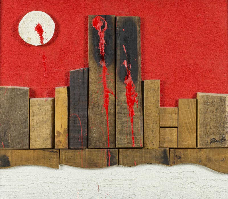 Pierluigi De Lutti (Monfalcone (Go) 1959) Doppia ferita 2001 Tecnica mista con applicazioni in legno su tavola, cm. 60x70 Firmato in basso a destra; Sul verso: firma, data, titolo e n. 1233TM. Autentica dell'Artista su foto con n. 1233TM.