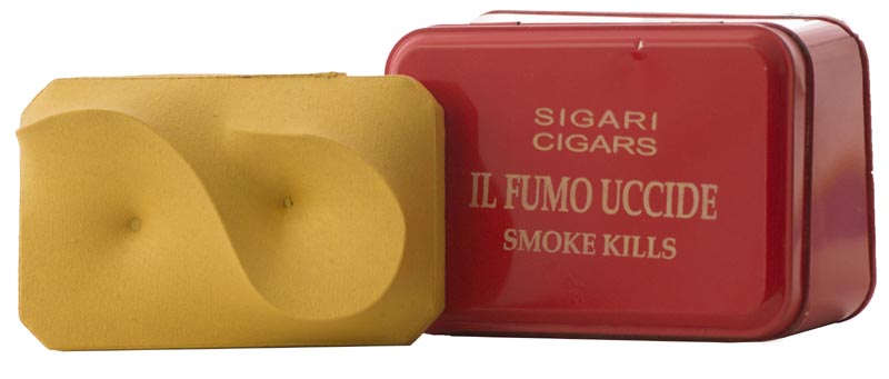 Giuseppe Amadio (Todi (Pg) 1944) Smoke Kills Tela estroflessa, cm. 9,5x14 posta all'interno di cofanetto porta sigari. L'Opera prende l'idea dagli avvertimenti scritti su ogni confezione di sigarette e sigari per la nocività del suo contenuto. Egli pone all'interno dei cofanetti un suo originale estroflesso per ricordare che l'arte è creatività e vita al contrario del fumo che uccide. Sul verso: scritto di Autenticità dell'Artista con timbro, firma e descrizione. Certificato di Autenticità dell'Artista.