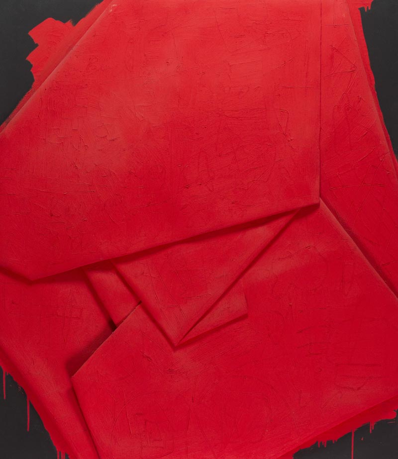 Cesare Berlingeri (Cittanova di Reggio Calabria 1948) Sul rosso piegato 2004 Olio e pigmenti su tela piegata, cm. 133x119x9 Sul verso: firma, data e titolo. Autentica dell'Archivio Dante Vecchiato, Padova, con n° G 1101-0875.