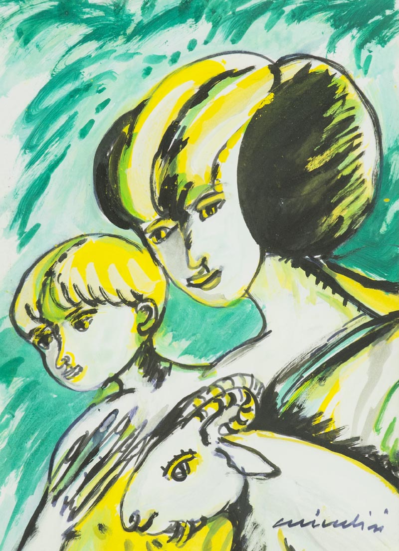 Remo Brindisi (Roma 1918 Lido di Spina (Fe) 1996) Pastorale Tempera su cartoncino, cm. 36x26 Firmato in basso a destra; Sul verso: scritto di Autenticità dell'Artista datato 1984; Etichetta di provenienza.