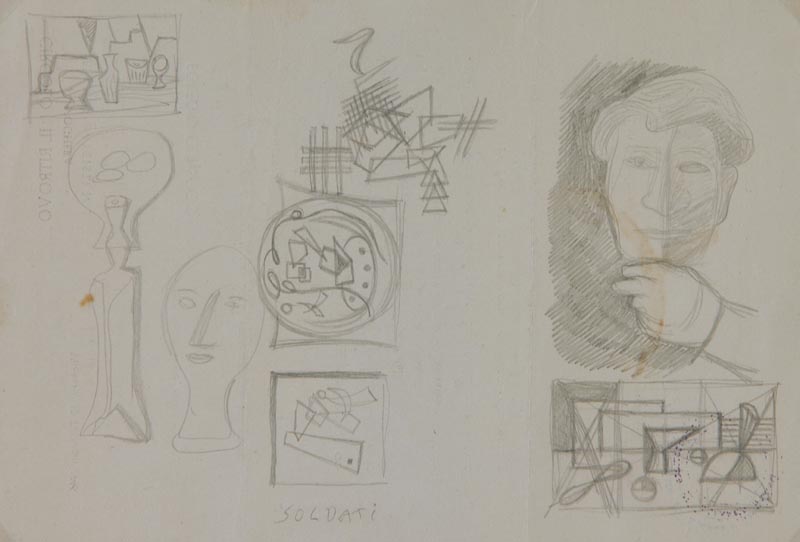 Atanasio Soldati (Parma 1896 Parma 1953) Senza titolo 1946 c.a. Disegno a matita su carta, cm. 15,5x22,5 Firmato in basso al centro. Sul verso: lettera del Dr. Ing. M. Morone. Autentica dell'Archivio Soldati su foto, con n° 1417, timbro e firma "Augusto Garau".