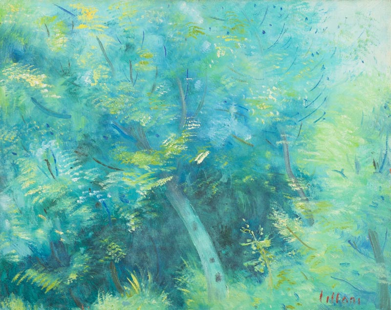 Umberto Lilloni (Milano 1898 Milano 1990) Boschetto 1965 Olio su tela, cm. 40x50 Firmato in basso a destra; Sul verso: , firma e data; Etichette: "X Mostra Nazionale d'Arte Figurativa", Settembre- Ottobre, 1968 , Imola; Etichetta "Galleria Annunciata", Milano, con descrizione dell'opera; Timbro: "Galleria Pace", Milano; Scritti di provenienza. Certificato di Autenticità "Galleria Ghelfi Giorgio", Montecatini Terme, su foto.