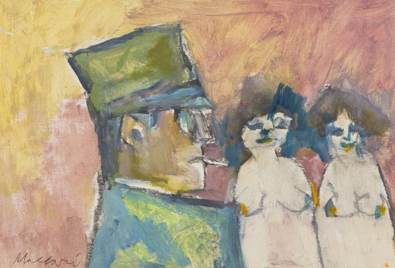 Mino Maccari (Siena 1898 Roma 1989) Senza titolo anni '70 Olio su cartoncino, cm. 23x32,5 Firmato in basso a sinistra. Autentica dell'Archivio delle opere di Mino Maccari a cura di Marco, Giuseppe e Bruna Maccari su foto con n° di Repertorio e firma Marco Maccari.