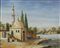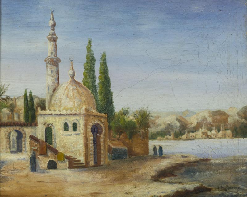 De Mango Paesaggio Orientale con figure Olio su cartone, cm. 44x54 Firmato in basso a destra. Craquelure sulla superficie pittorica.