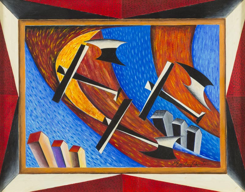 Agibeci Futurista (ROMA 1898 1991) Aerofuturista - Incursione al chiaro di luna Tecnica mista e collage su carta applicata su tela, cm. 40x50 Firmato in basso a destra; Sul verso: firma, intervento pittorico ed etichetta dell'Artista.
