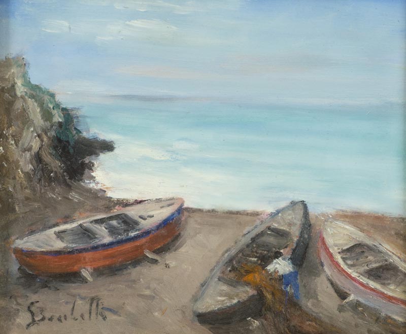 Gaetano Bocchetti (Napoli 1888 1990) Barche sulla spiaggia Olio su tavola, cm. 25x30 Firmato in basso a sinistra; Sul verso: firma.