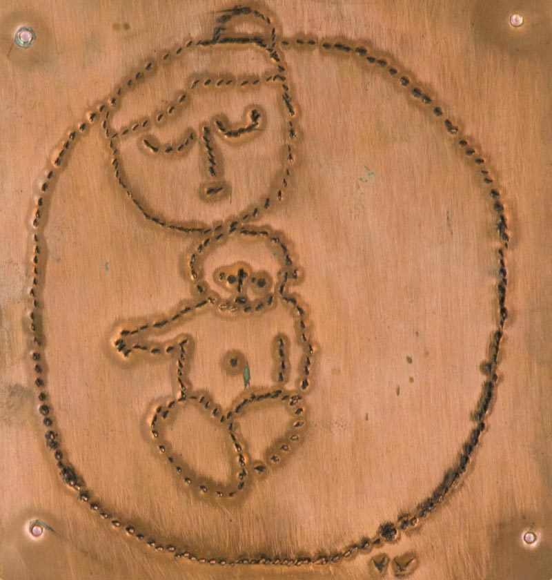 Venturino Venturi (Loro Ciuffenna (Ar) 1918 2002) Maternità Lastra di rame sbalzato, cm. 20x20 Siglato in basso a destra; Sul verso: timbro "Archivio Venturino Venturi con Archivio n° 420". Bibliografia: Lucia Fiaschi "Venturino Venturi, Catalogo Generale Volume I",Carlo Cambi editore, pag. 195. Autentica della Dott.ssa Lucia Fiaschi su foto, con Archivio n° 420 timbro a secco.