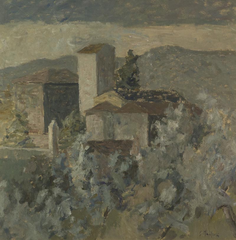 Giuseppe Manfredi (Seravezza (Lu) 1934 Montecatini Terme (Pt) 1987) Paesaggio Olio su cartone cm. 70x70 Firmato in basso a destra.