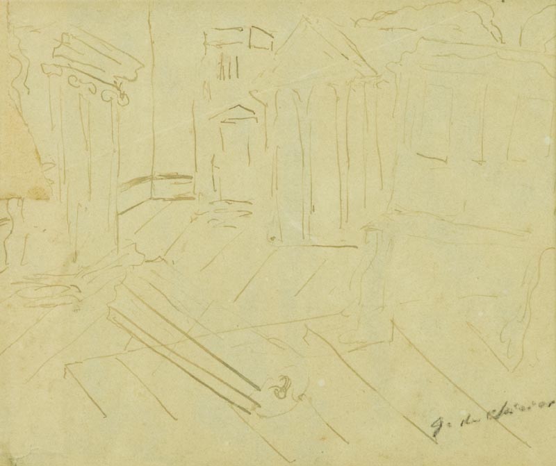 Giorgio De Chirico (Volos 1888 Roma 1978) Templi Seconda metà anni '20 Inchiostro su carta, cm. 17,8x22,3 Firmato in basso a destra. Autentica di "Claudio Bruni Sakraischik", con descrizione dettagliata dell'Opera e timbro a secco, su foto.