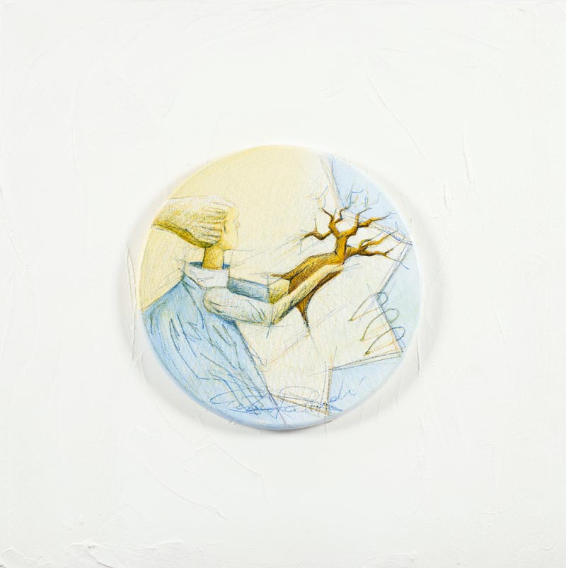 Maria Cristina Palandri (Pistoia) Gli Angeli ci raccontano 2006 Tecnica mista su tela circolare di diametro cm. 20, applicata sul tela dipinta cm. 40x40 Firmato in basso al centro; Sul verso: firma, data e titolo.