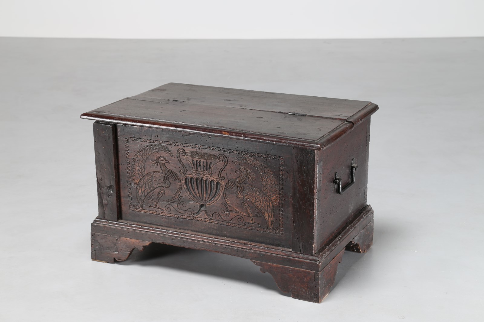 MANIFATTURA ITALIANA DEL XVII SECOLO Cassapanca scolpita. Legno. Cm 70,00 x 44,00 x 46,00.