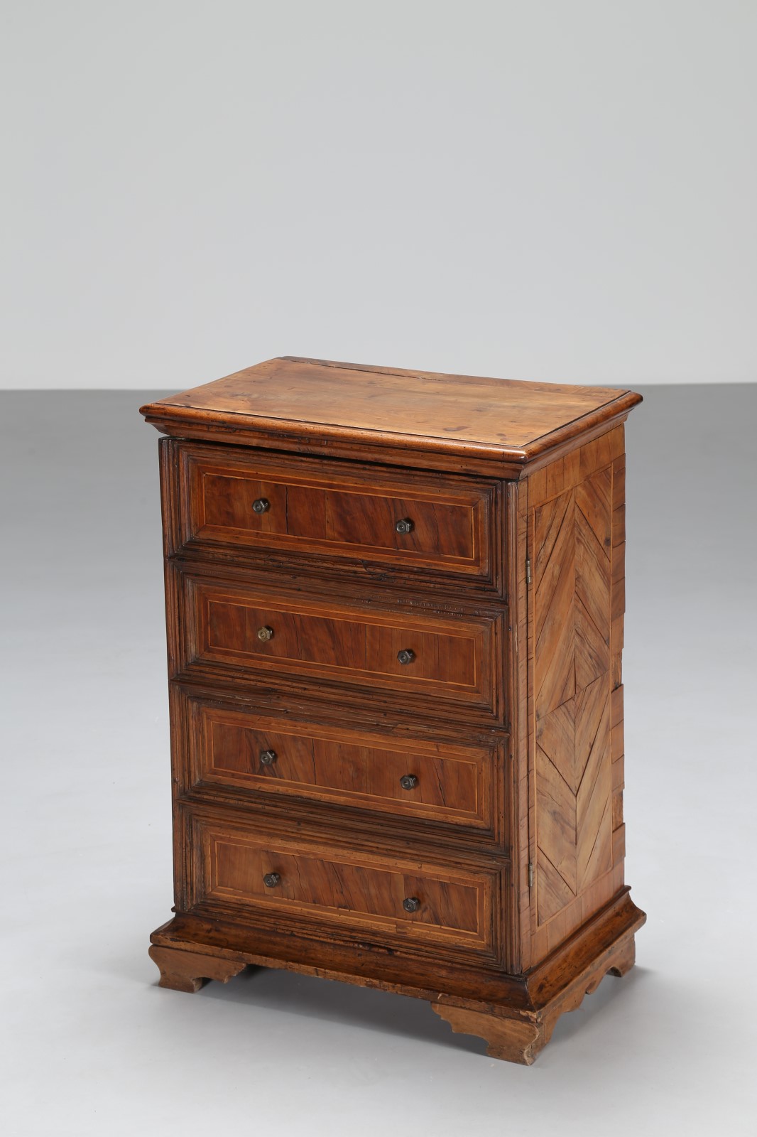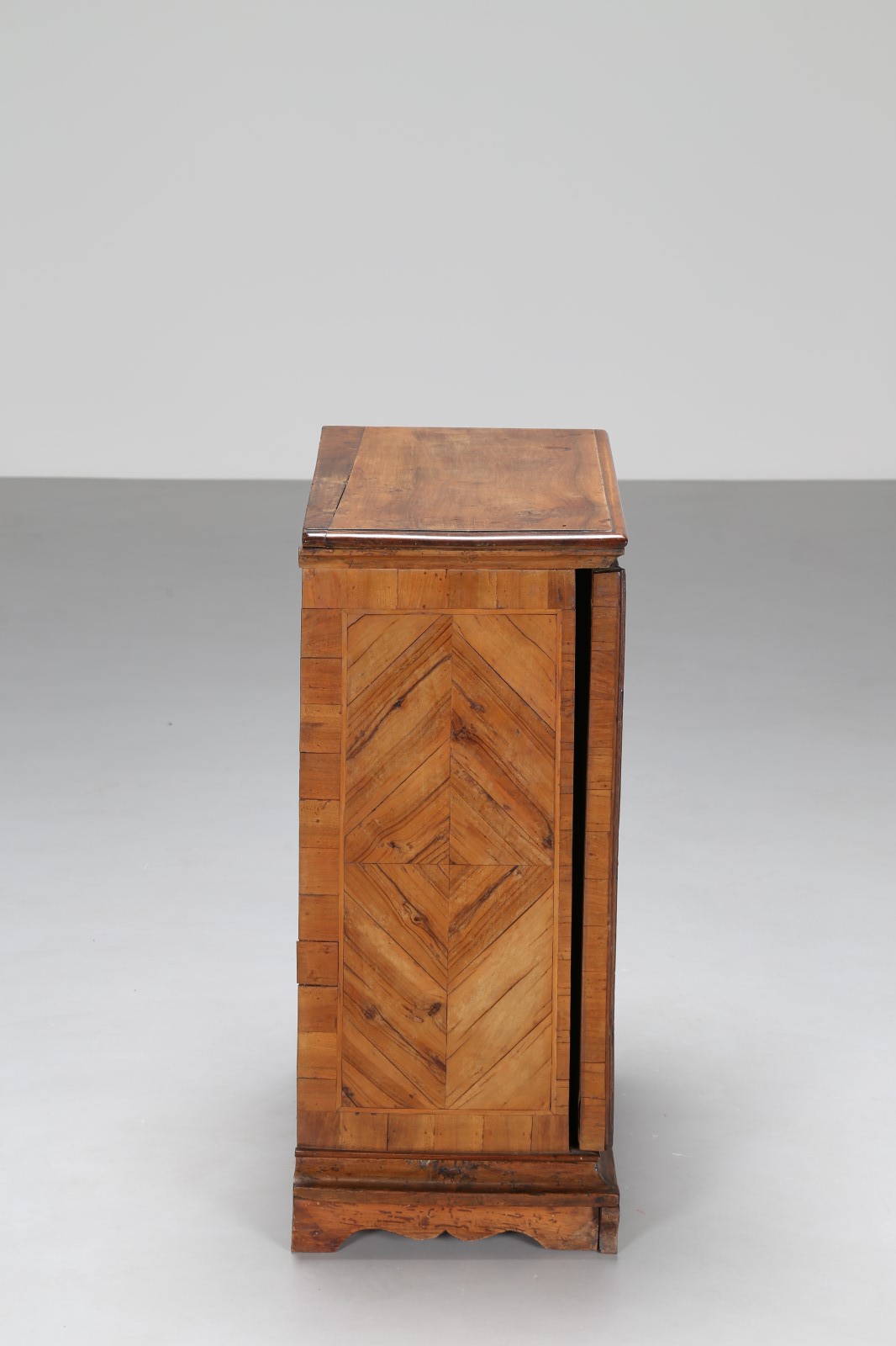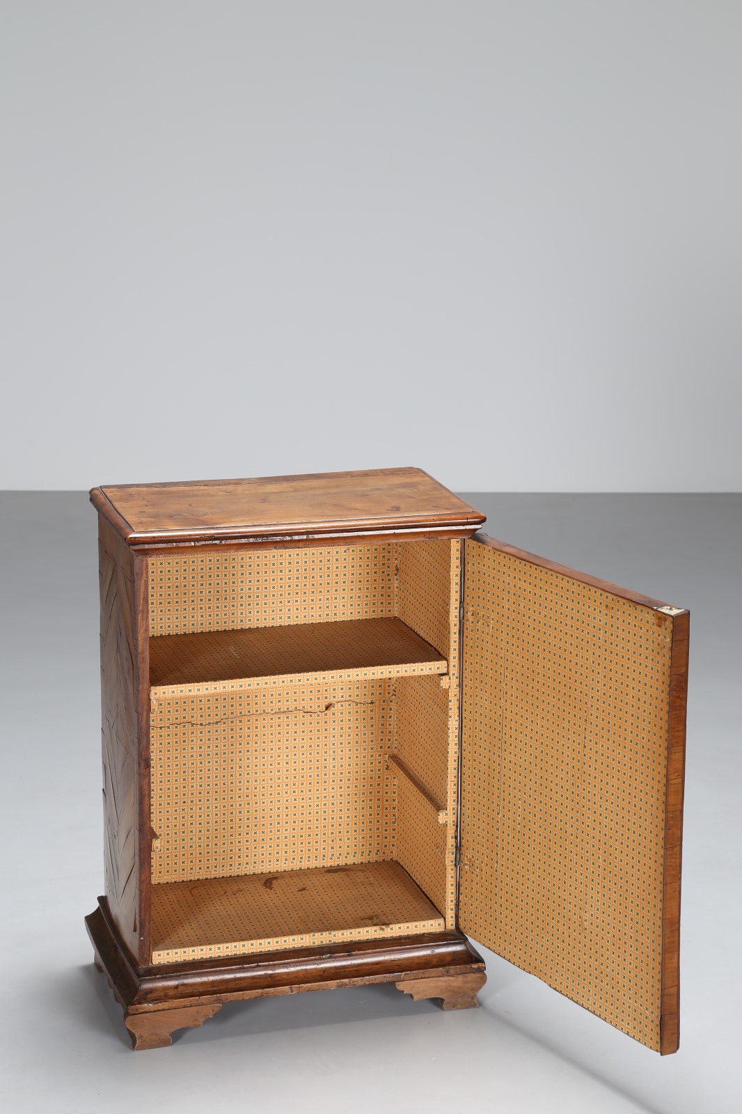 MANIFATTURA ITALIANA DEL XVIII SECOLO Comodino lastronato ad un'anta. Radica...