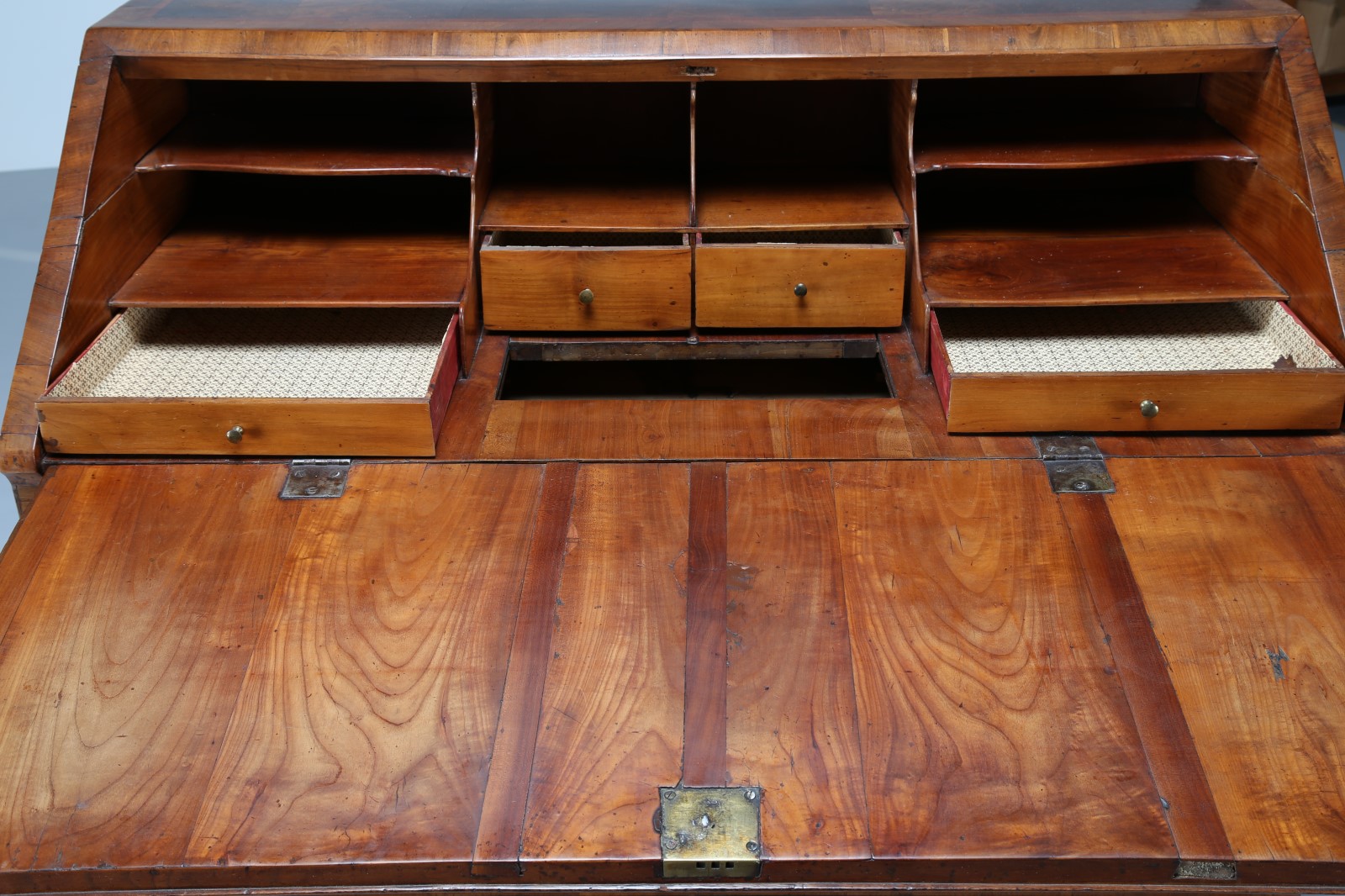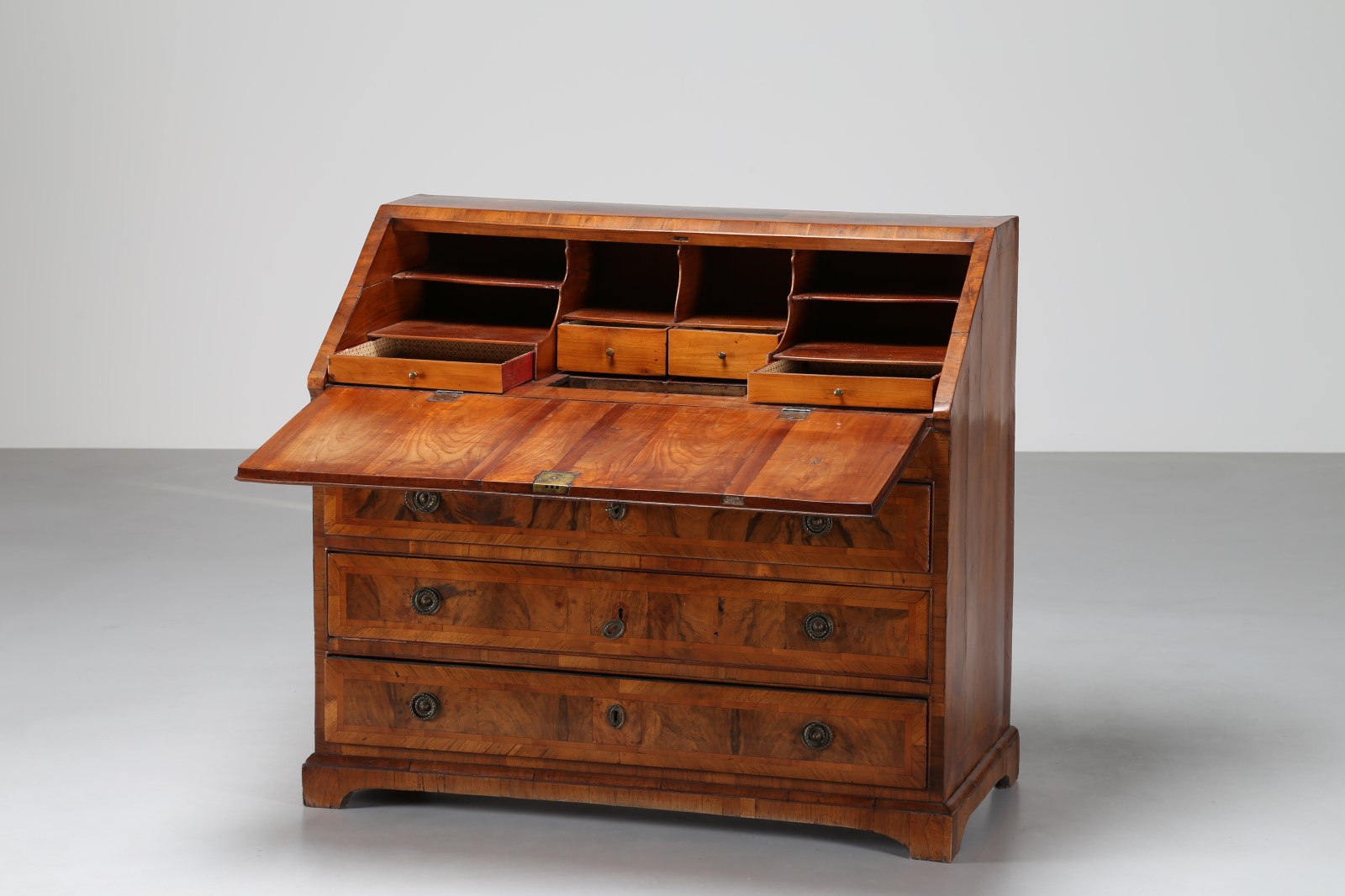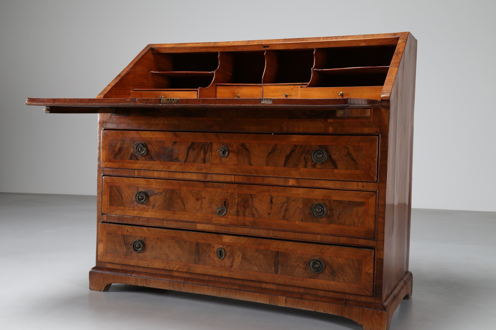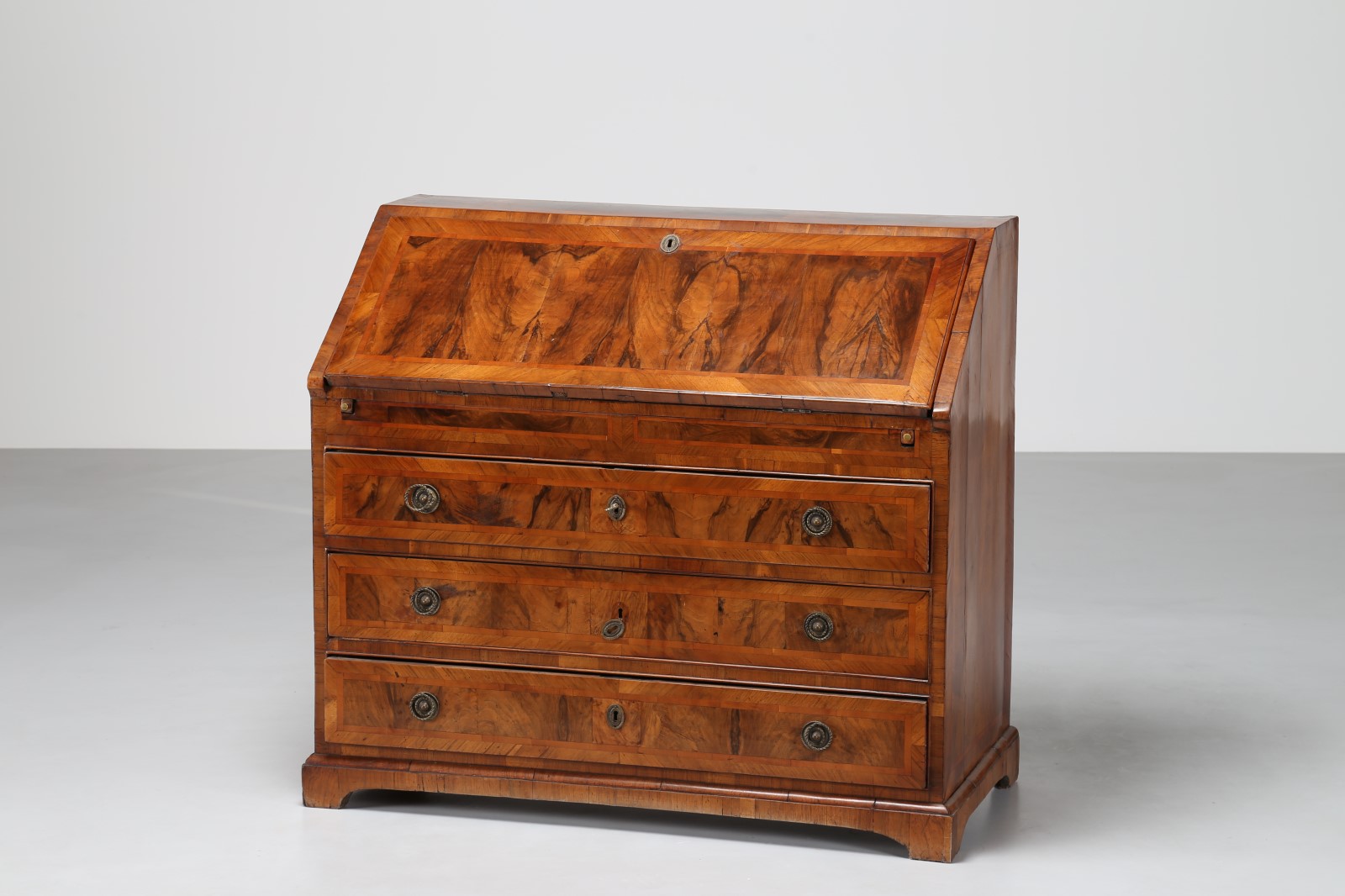 MANIFATTURA VENETA DEL XVIII SECOLO Cassettone a ribalta lastronato in radica di noce. . Cm 117,00 x 107,00 x 59,00.