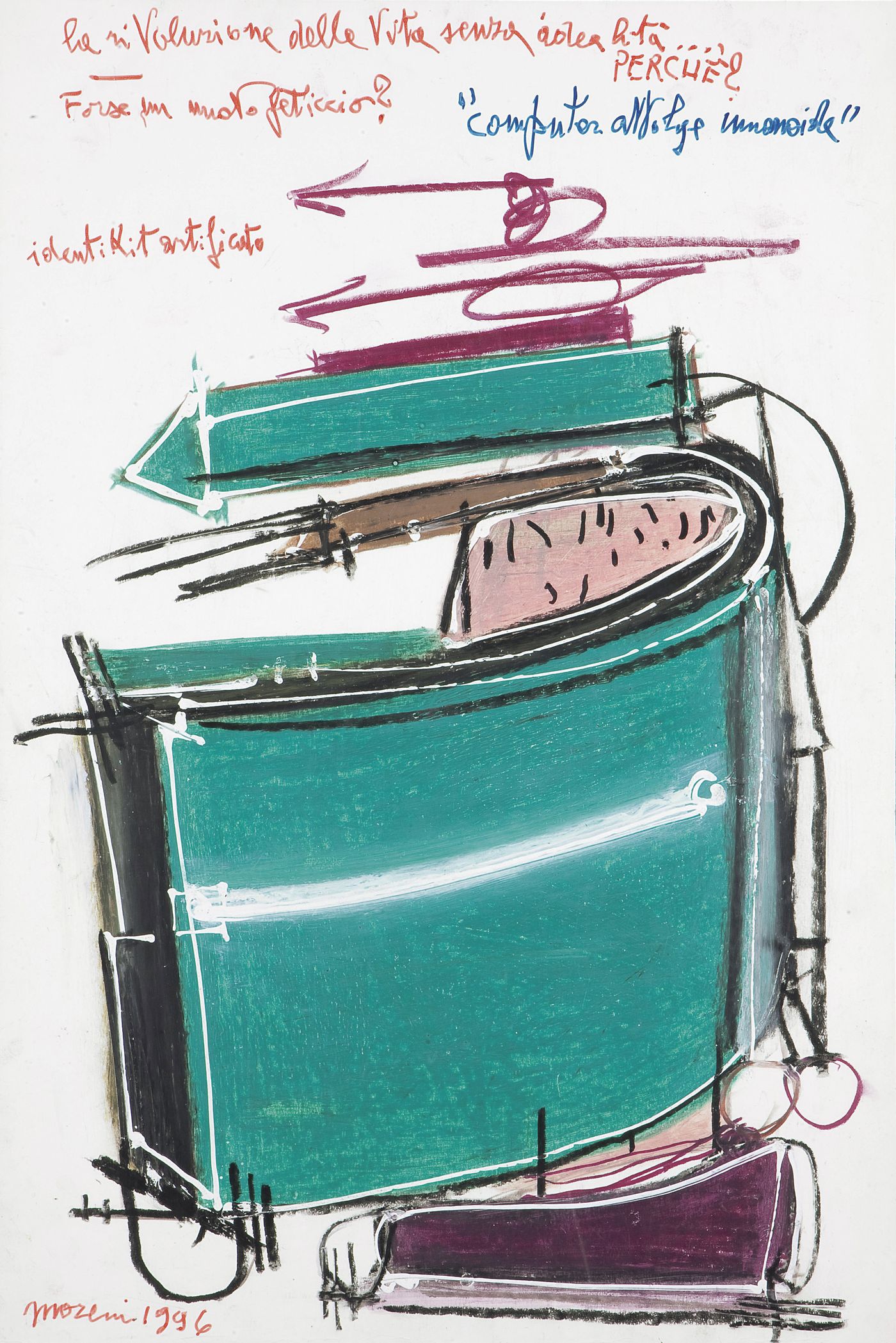 MORENI MATTIA (Pavia 1920 - 1999 Brisighella (RA)) - "Computer avvolge umanoide" 1996, 48x72 tecnica mista su carta. Opera firmata e datata in basso a sinistra, intitolata in alto a destra
