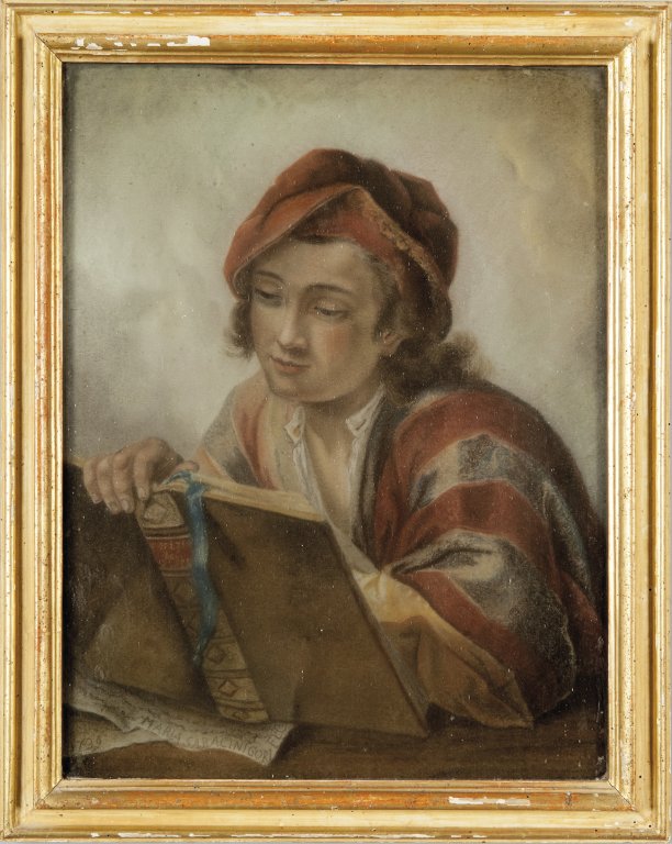 "Figura che legge" pastello su carta riportata su tela, f.to e d.to 1739 in b.a s.
