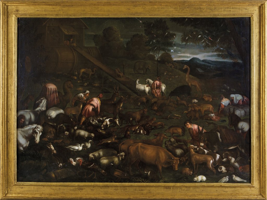 "L'ingresso degli animali nell'Arca di Noè" olio, cornice coeva a cassetta in legno finemente intagliato e dorato