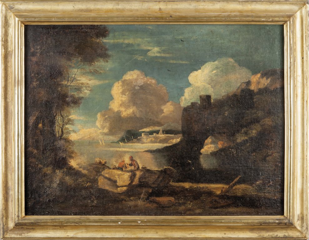 Scuola genovese sec.XVII "Veduta costiera con castello e due pescatori in primo piano" olio