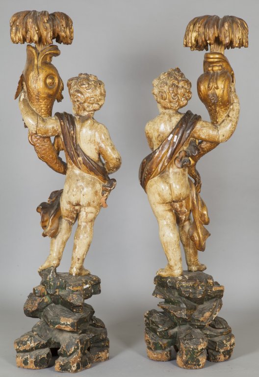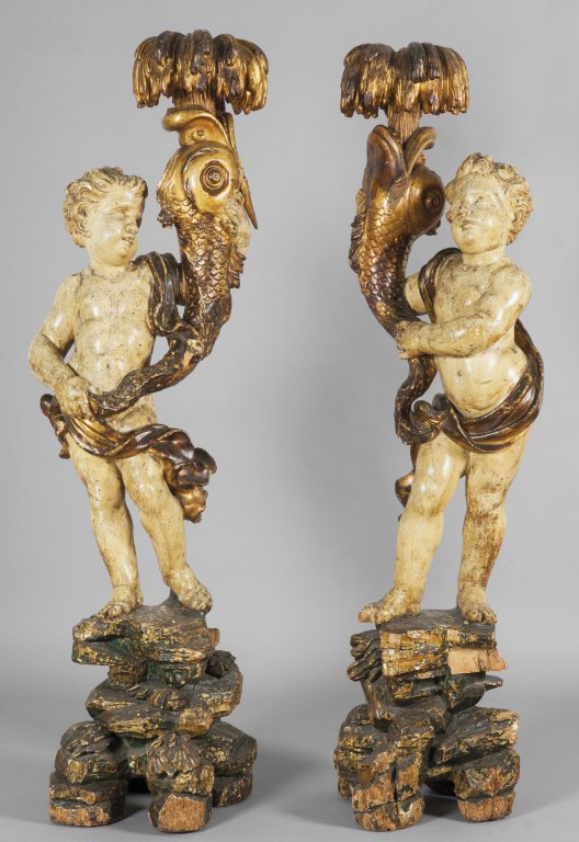 Coppia di putti portatorciera a forma di delfino in legno intagliato, laccato...
