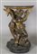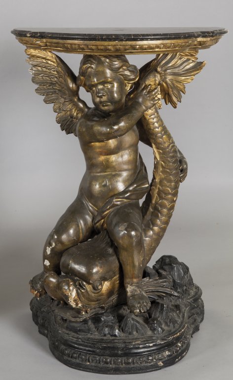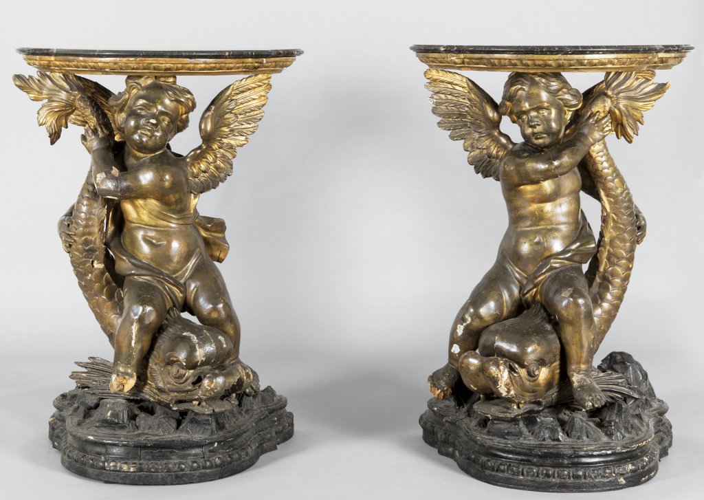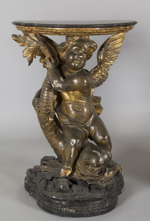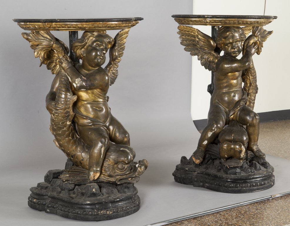 Coppia di consoles in legno finemente intagliato e dorato raffiguranti un putto a cavallo di un delfino, piano in marmo portoro, Genova I metà sec.XVIII
