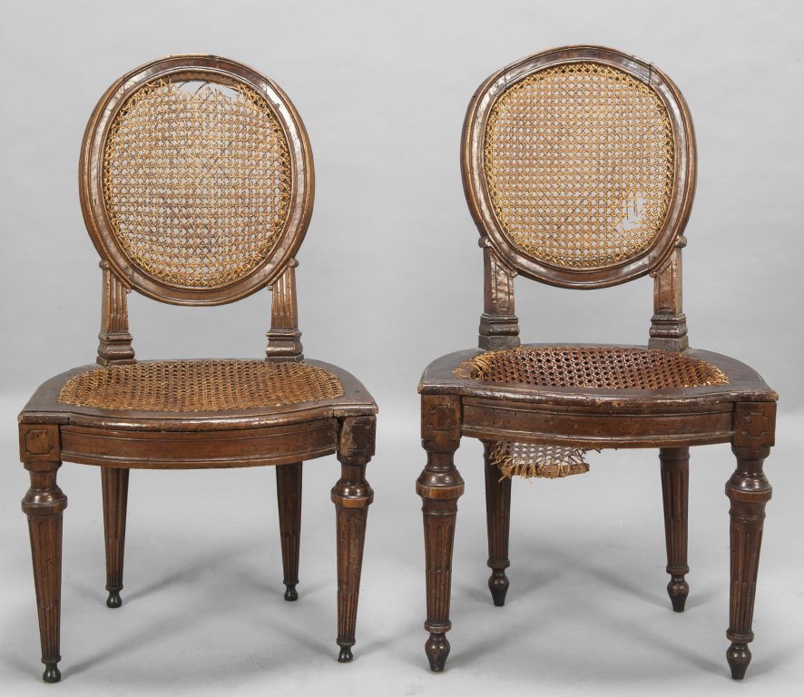 Coppia di piccole sedie ovaline Luigi XVI in noce con cannè, Genova fine sec. XVIII (rotture)