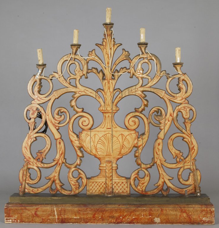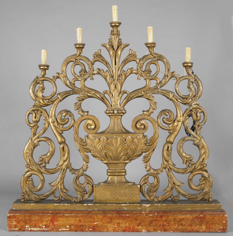 Coppia di portacandele a 5 luci in legno intagliato e dorato, vaso centrale da cui si dipartono i bracci, sec. XVIII