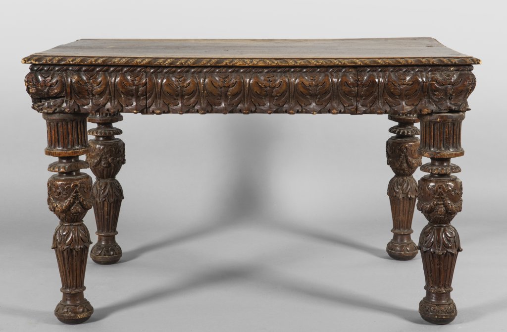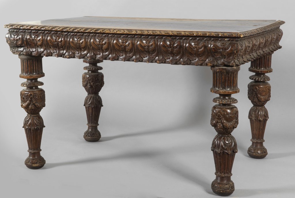 Tavolo in noce con fascia e gambe intagliate in stile cinquecentesco