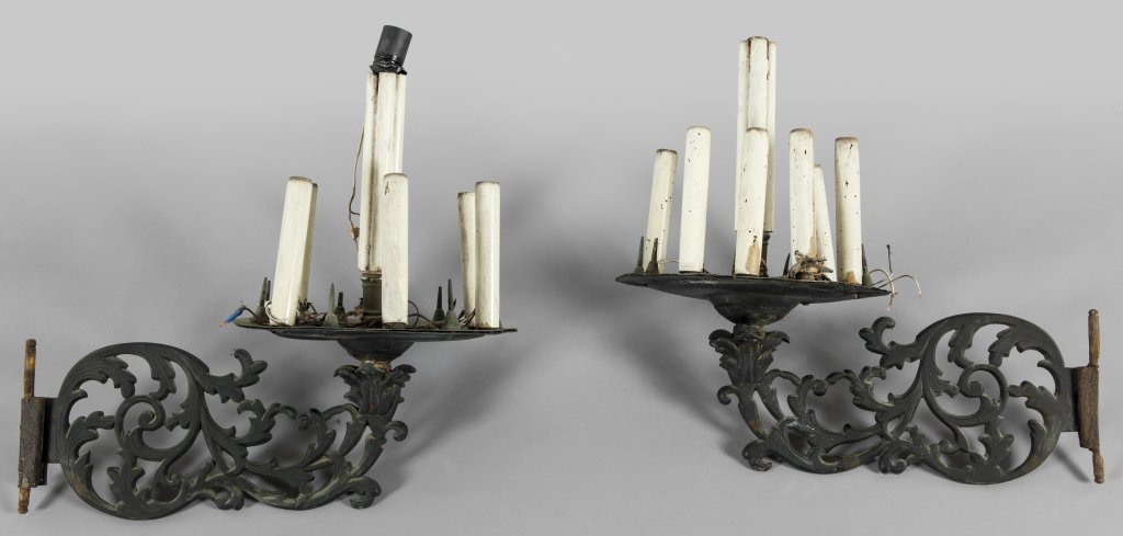 Coppia di antichi bracci in ferro traforato che reggono un piatto portacandele