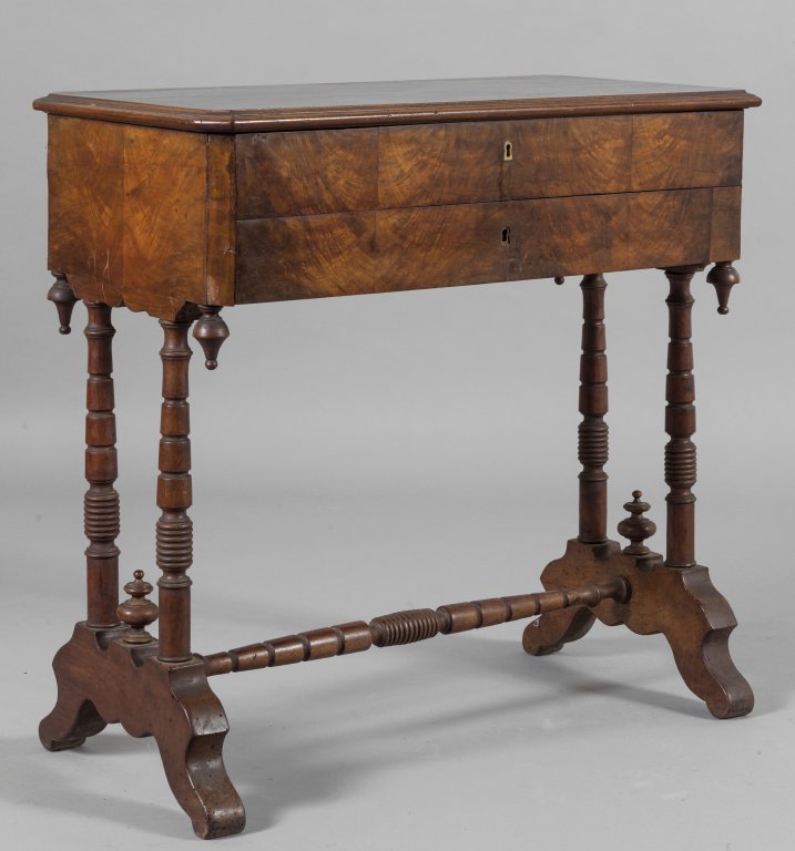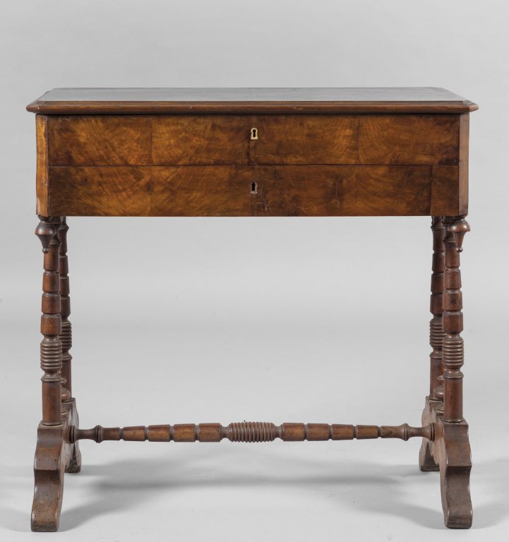 Toilette da centro lastronata in piuma di mogano, cassetto sul fronte e piano ribaltabile, Genova sec.XIX
