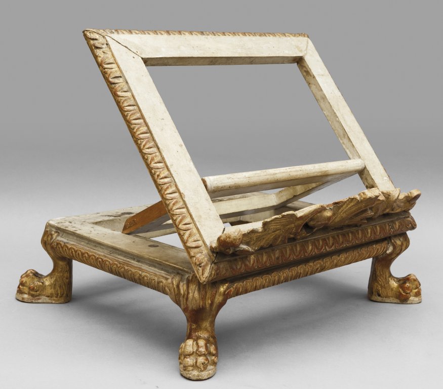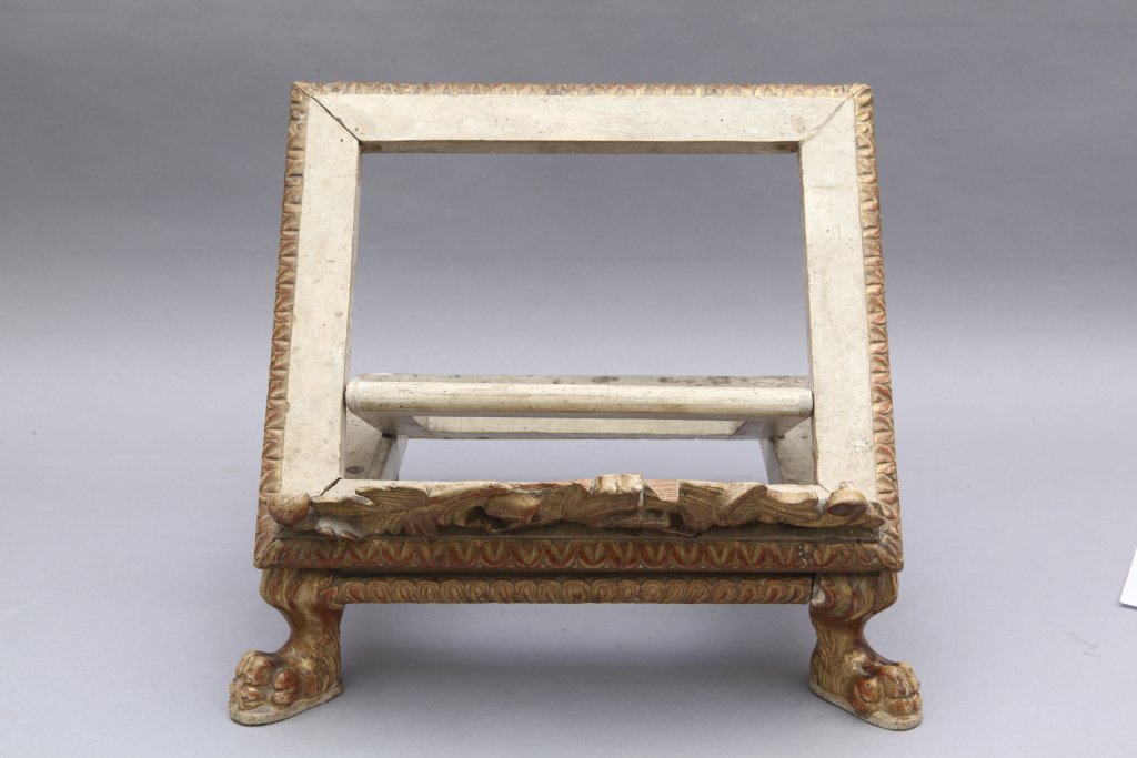 Antico leggio in legno intagliato, dorato e laccato, piedi ferini, inzi sec.XIX
