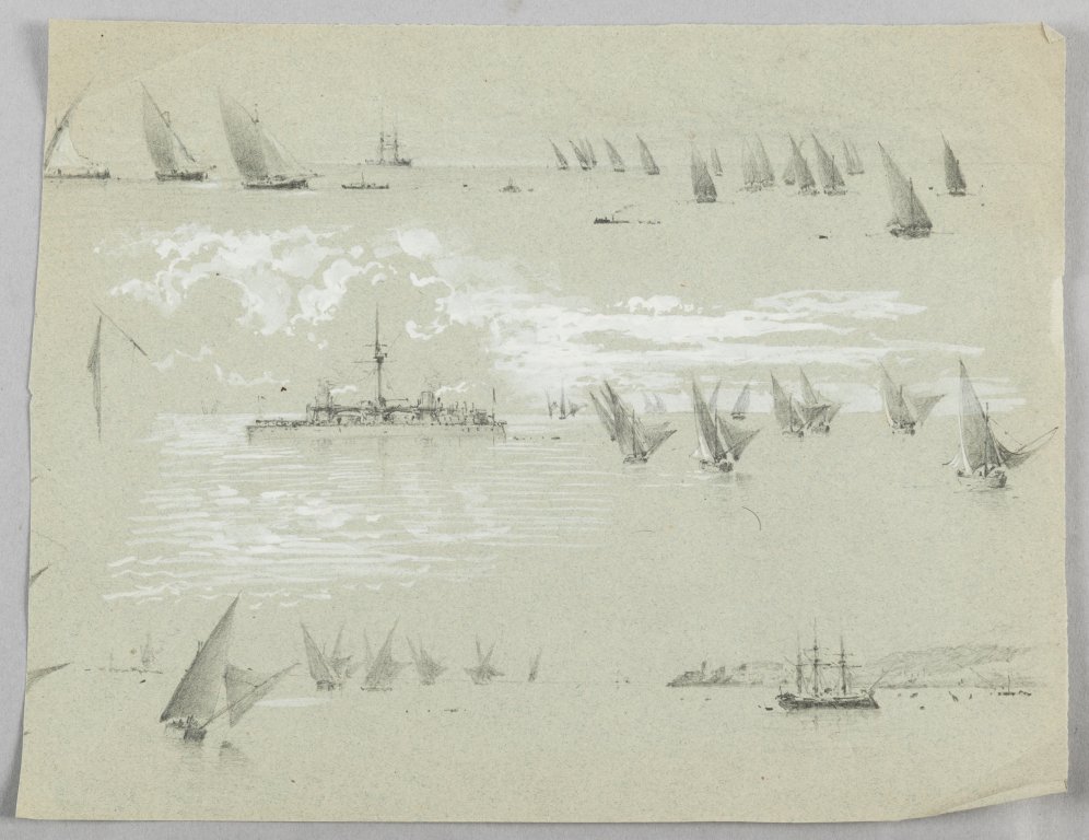 Cartella contenente 10 disegni non firmati raffiguranti velieri e paesaggi
