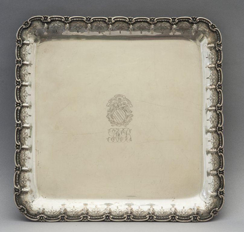 Grande alzata di forma quadrata in argento con bordo sbalzato al centro stemma nobiliare, inizi sec.XX