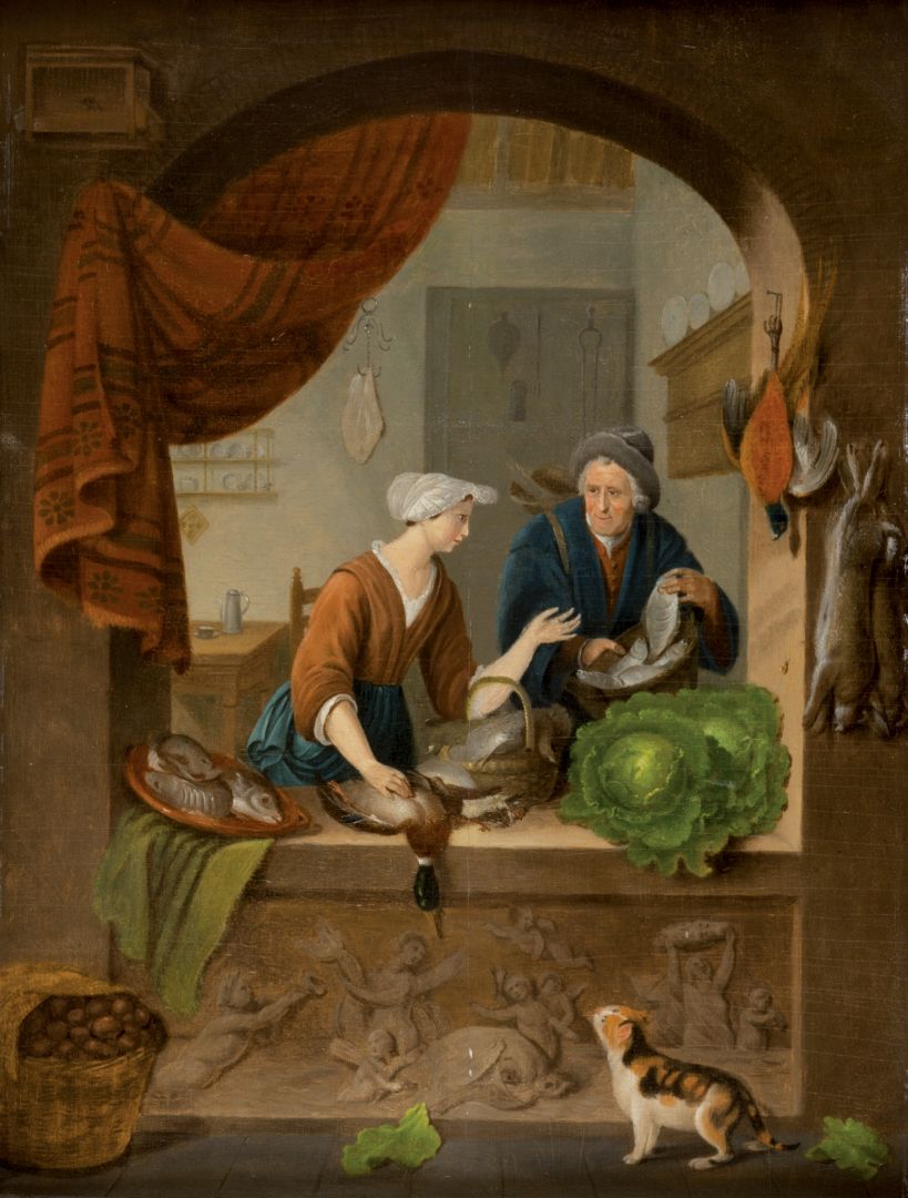 PITTORE FIAMMINGO FINE XVIII SECOLO Interno di cucina con uomo e donna,...