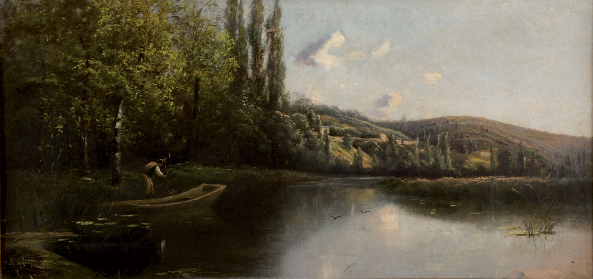 PITTORE FRANCESE XIX SECOLO Il lago 1890 Olio su tela cm 46 x 94 Firma e data...