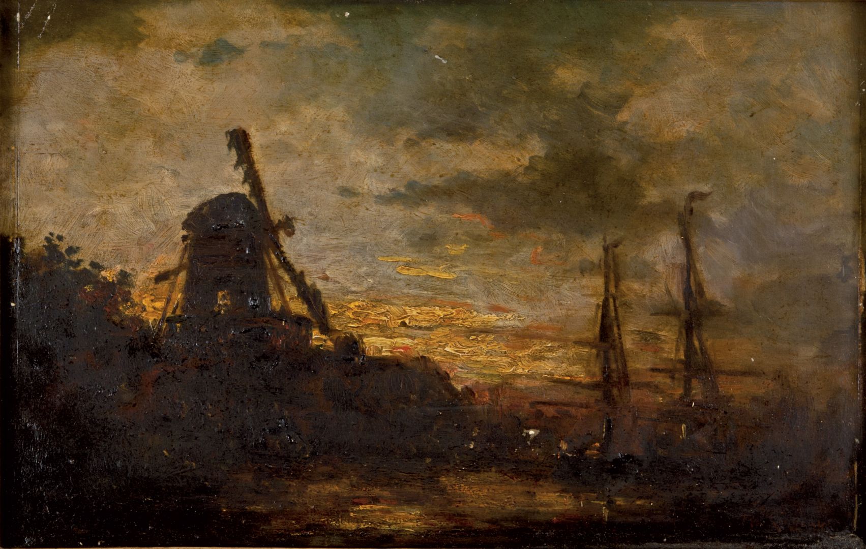THEODORE ROUSSEAU Parigi 1812 - Barbizon 1867 Paesaggio con mulino e barche...