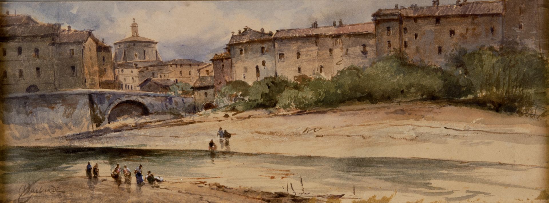 ONORATO CARLANDI Roma 1848 - 1939 Lavandaie sul Tevere Aquerello su carta cm...