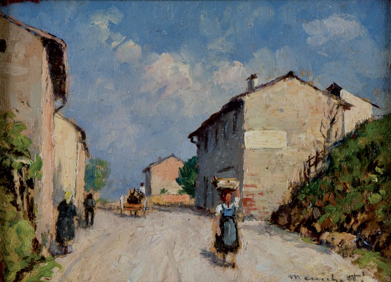 MARIO MENICHETTI Livorno 1889 - 1975 Scorcio di paese con figura Olio su...