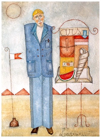 SERGIO LAZZERINI Pisa 1951 Venditore e altarino Olio su tavola preparata 50 x 36,5. Firma in b. a d.; sul verso misure e titolo.