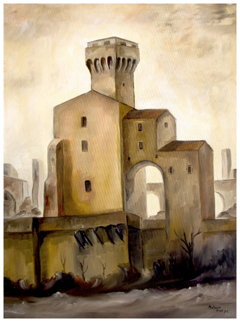PIERANGELO MATTEONI Pisa Cittadella 1975 Olio su tela 70 x 50. Firma e data in b. a d.; sul verso firma, data, titolo + etichetta illeggibile.