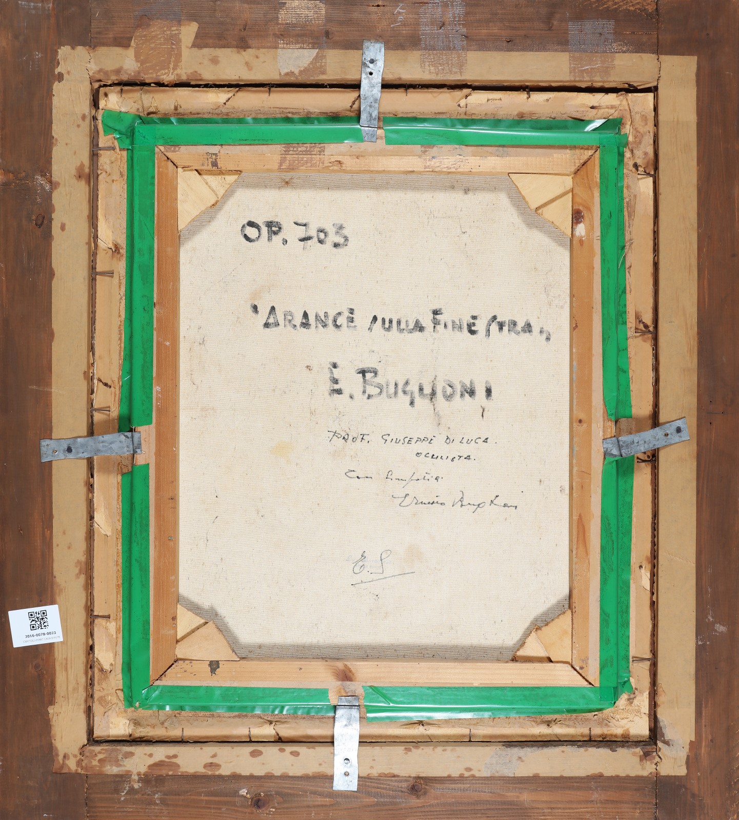 BUGLIONI ERNESTO (n. 1914) Arance sulla finestra. Olio su tela. Cm 48,00 x 58,00. Firmato in basso a sinistra. Al retro titolo, firma e timbro Galleria La Barcaccia, Fiuggi. Cornice presente