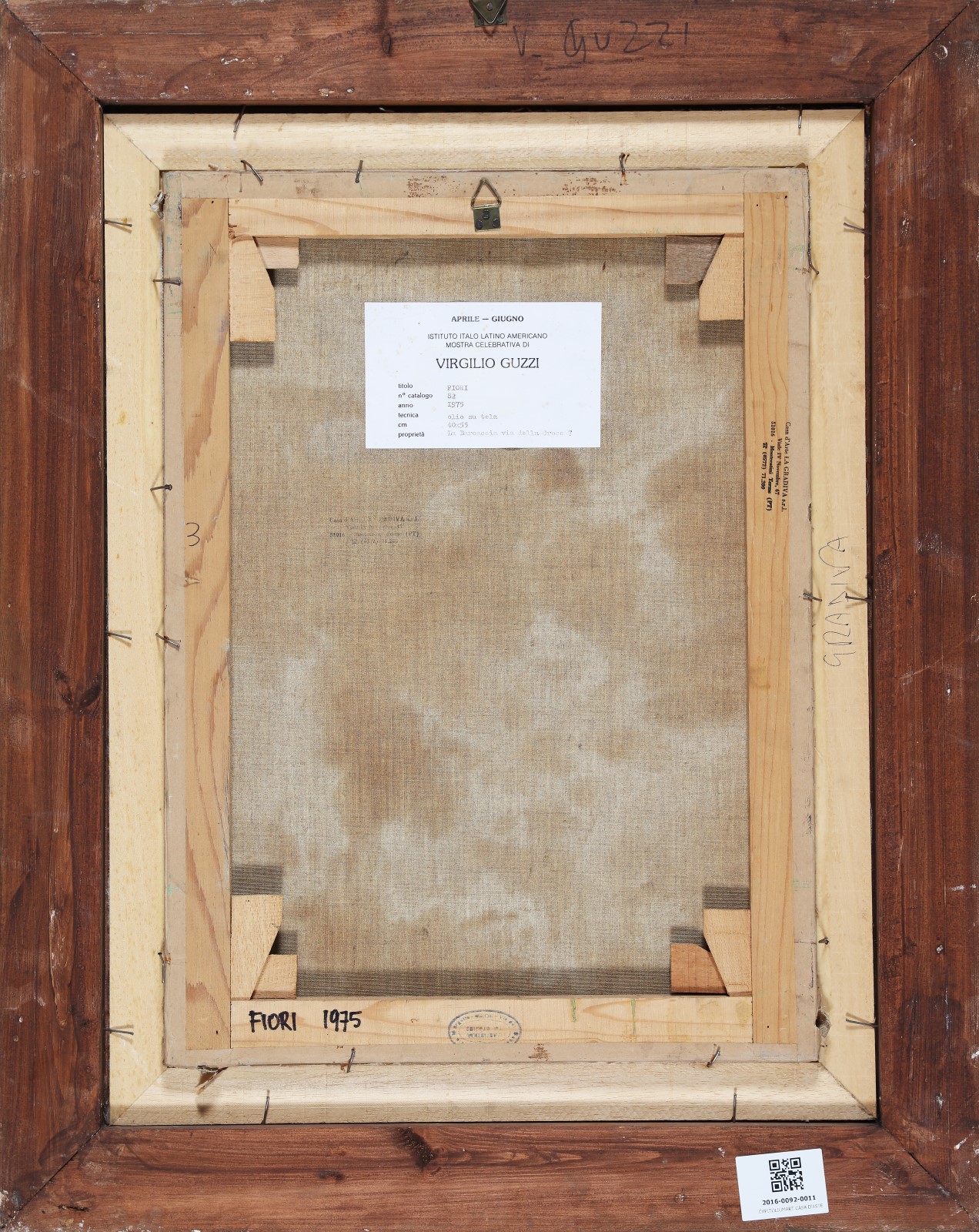 GUZZI VIRGILIO (1902 - 1978) Fiori. 1975. Olio su tela. Cm 40,00 x 55,00. Firma in alto a destra. Al retro timbro della Casa d'Arte la Gradiva, Montecatini Terme (PI); Cartiglio dell'Istituto Italo latino americano. Autentica su fotografia a cura degli Archivi Guzzi, Roma. Esposizioni: Istituto Italolatinoamericano , Roma Mostra personale dell'artista, Aprile - Giugno 1981 ( fotocopia della pubblicazione); Comune di Ferrara Palazzo Massari Mostra personale dell'artista, Gennaio - Marzo 1982 (Fotocopia della pubblicazione); Galleria la Barcaccia, Roma, mostra personale dell'artista, Aprile 1975 (Fotocopia della pubblicazione). Cornice presente
